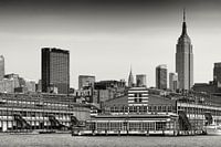 New York City in Schwarzweiss: Ein Blick über den Hudson River auf die Skyline von Midtown Manhattan mit dem Empire State Building und dem Chrysler Building.