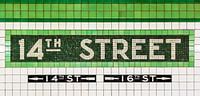 New York Subway in Manhattan, de straatnaam 14th Street in een groen mozaïek op de muur van Station 14th Street in de metro van New York City, diep onder de grond van de grote stad.