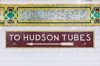Kunstig mozaïek in de metro van Manhattan in New York, deze kant op naar de Hudson Tubes, op de muur van het metrostation diep onder de grond van de grote stad.