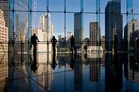 Een uniek tijdsbeeld, gefotografeerd in New York Winter Garden Atrium. De bezoekers in silhouet kijken uit over de werkzaamheden op Ground Zero. De plek waar voorheen de Twin Towers stonden. Het uitzicht met de wolkenkrabbers op de achtergrond, zoals hier is getoond, is nu niet meer te zien door het herrijzen van de nieuwe Freedom…