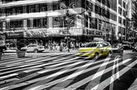 De afbeelding toont een typische gele New Yorkse taxi die Broadway oversteekt. Het toont dezelfde plaats op verschillende tijdstippen, wat het snelle tempo van New York moet weergeven.