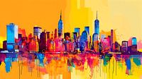 Een levendig en kleurrijk Popart skyline van New York, met de iconische wolkenkrabbers van Manhattan, weerspiegeld in het water in speelse tinten. De gebouwen steken hoog af tegen een abstracte achtergrond, wat een levendige sfeer creëert die de energie en opwinding van het bruisende stadsbeeld van New York in de zomer perfect weergeeft.