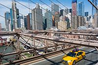 Vanaf de Brooklyn Bridge hadden we een prachtig uitzicht over de stad New York. Ik heb geprobeerd de schuine kabels te laten contrasteren met de verticale lijnen van de gebouwen op de achtergrond. De gele taxi is weer een mooi contrast met de blauwige gebouwen.