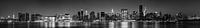 Deze zwart-witfoto toont een adembenemend panoramisch uitzicht op de skyline van New York City bij nacht. De skyline is vol met talrijke hoogbouw en iconische wolkenkrabbers, waaronder het Empire State Building en het Chrysler Building, die beide duidelijk herkenbaar zijn.