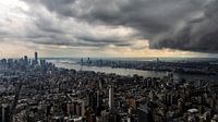 Deze foto is genomen vanaf het bovenste gedeelte van het Empire State Building. je kijkt van bovenaf op Manhattan van de stad New York en op de Hudson Rivier. In de verte is het Vrijheidsbeeld zichtbaar. De dreigende onweersbuien zijn al losgebarsten in de verte en komen razendsnel dichterbij. Een paar minuten na deze foto begon het al gigantisch hard te regenen. De ondergaande zon die nog langs en onder de donderwolken door schijnt zet de stad in een mooi contrastrijk licht.