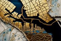 Een abstracte kaart van New York met de Brooklyn Bridge en voorgestelde wolkenkrabbers in een gedeeltelijk gouden metaallook en gemarmerd met insluitsels van lapis lazuli.