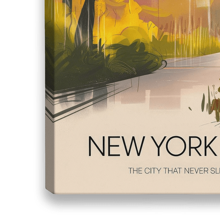 Het landschap, waarin de metropool gehuld is in een warm licht, schittert in gloeiende herfsttinten. Zachte lijnen leiden het oog door het rustige parklandschap, met wolkenkrabbers die tussen de bomen door gluren. Dit kunstwerk is perfect voor de woonkamer en brengt een vleugje stedelijke elegantie en levendige natuur in elke kamer.