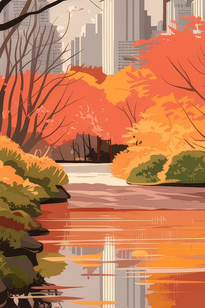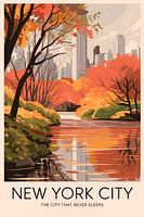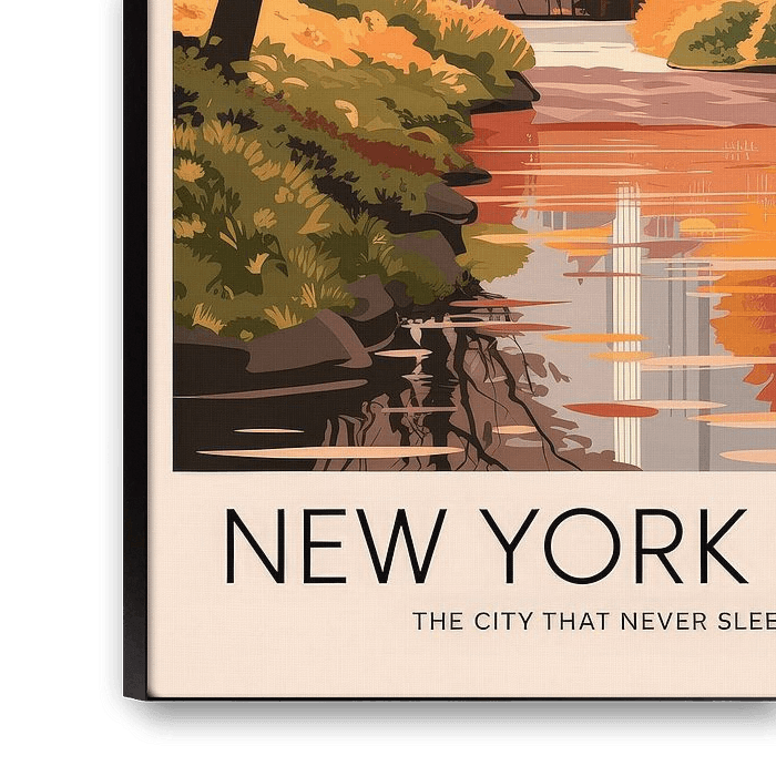 Een harmonieus samenspel van warme herfsttinten en stedelijke flair voert de kijker mee naar de levendige achtergrond van New York. Het kalm stromende water weerspiegelt de etherische schoonheid van de natuur, terwijl de imposante wolkenkrabbers de constante hartslag van de stad belichamen. Ideaal voor in de woonkamer om je op elk moment onder te dompelen in een inspirerende sfeer.