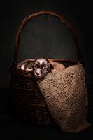 Dit is een studiofoto van een newborn puppy. De puppy slaapt en ligt met zijn hoofdje op de rand van een rieten mand.