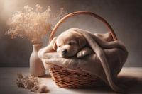 Dit is een digitaal beeld van een puppy in een rieten mand. De puppy is gewikkeld in een dekentje, het licht valt binnen langs de linkerbovenhoek. Op de tafel staan ook droogbloemen.