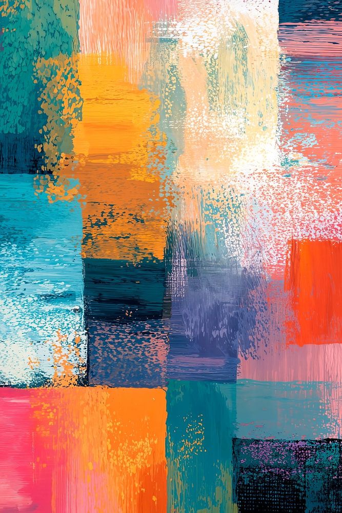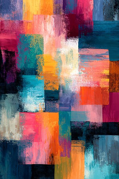 Een abstract schilderij met een gestructureerde, impasto-techniek, bestaande uit een levendig mozaïek van rechthoekige kleurvlakken. De vlakken zijn in een verspringend, overlappend patroon gerangschikt, wat een gevoel van diepte en een dynamische compositie creëert.