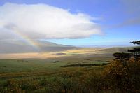 Een regenboog vertoont zijn prachtige kleuren aan de rand van de Ngorongoro.