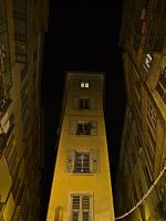 Nachtopname van de historische oude stad Nice aan de Middellandse-Zeekust (Cote d'Azur) in het zuiden van Frankrijk met de verlichte voorgevel van een oud, smal gebouw in een smalle steeg.