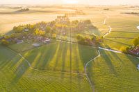 Zicht op het dorpje Niehove in de provincie Groningen op de vroege ochtend tijdens zonsopkomst. Het silhouet van het dorp is zichtbaar in de lange schaduwen (waaronder de 13e eeuwse Kerk van Niehove).