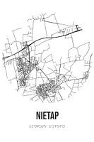 Zwart-witte landkaart, stratenplan of plattegrond van Nietap. Nietap is gelegen in de gemeente Noordenveld, provincie Drenthe. Op de stadskaart zijn alle openbare wegen in Nietap opgenomen. Verder is de kaart voorzien van de coördinaten van het centrum van Nietap.