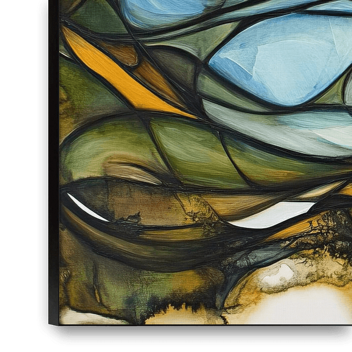 Nieuw-Zeeland Abstract | Whispering Winds - Dit abstracte schilderij representeert een verwevenheid van kleuren en vormen, vermoedelijk geïnspireerd door de diversiteit en dynamiek van het Nieuw-Zeelandse landschap.