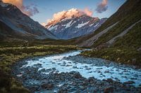 Een prachtige foto van Mount Cook, de hoogste berg van Nieuw-Zeeland, oplichtend in een prachtige alpenglans tijdens de schemering. De foto is genomen vanuit Hooker Valley en legt de majestueuze schoonheid van de Nieuw-Zeelandse Alpen vast in de ondergaande zon.