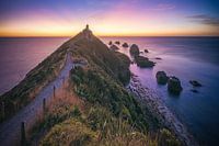 De iconische vuurtoren bij Nugget Point vlak voor zonsopgang in het zeer dramatische ochtendlicht.