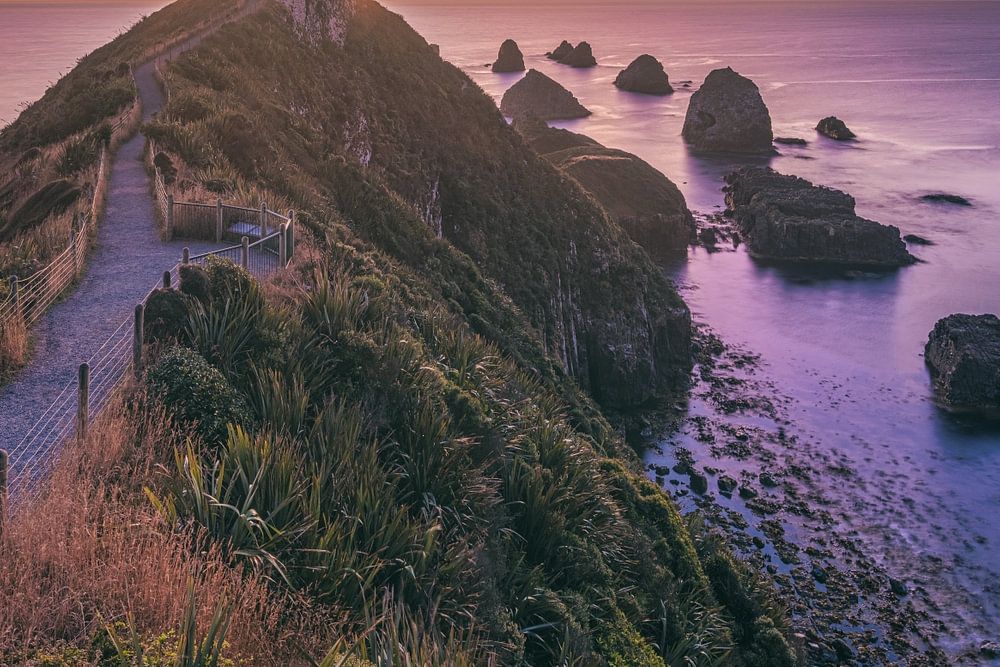 De iconische vuurtoren bij Nugget Point vlak voor zonsopgang in het zeer dramatische ochtendlicht.