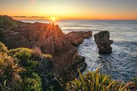 Schilderachtige zonsondergang boven de Pancake Rocks op het Zuidereiland van Nieuw-Zeeland.