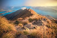 Roy's Peak schittert in het zachte ochtendlicht en baadt het majestueuze berglandschap in een warme, gouden gloed. De glooiende heuvels en grasvlakten rond de berg gloeien in het vroege daglicht en het landschap is vervuld van een rustige maar krachtige sfeer. De opkomende zon creëert een betoverende achtergrond die de natuurlijke schoonheid van Roy's Peak in haar volle glorie laat zien.