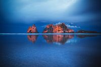 Prachtige reflectie en dramatisch licht op de rotsen bij Wharariki Beach op het Zuidereiland van Nieuw-Zeeland.