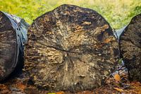 Nieuw herfstleven op doorgezaagde boomstammen liggend tussen herfstbladeren