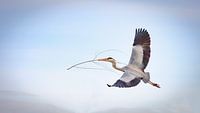 Een reiger met een missie. Hij heeft een lange tak gevonden en is daarmee onderweg naar het nest om dat verder af te maken. Het ligt aan mij natuurlijk, maar die reiger ziet er blij en gelukkig uit. Hij kwam echt vlakbij, maakte ook een cirkel om de boom goed aan te vliegen. Toen zag ik ook de spanwijdte van het dier.