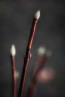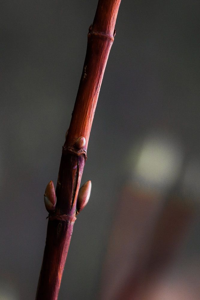 Een tak van de hortensia met nieuwe knoppen in selectieve focus tegen een donkere achtergrond