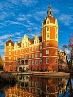 Dit prachtige paleis in neorenaissancestijl ligt in het Fürst Pückler Park Bad Muskau/Park Mużakowski, dat sinds 2 juli 2004 op de Werelderfgoedlijst van de UNESCO staat en gelegen is in het district Görlitz in Saksen, Duitsland. Deze foto is genomen kort voor zonsondergang, tijdens het Gouden Uur, en het roodachtige en zachte licht tijdens dit tijdstip geeft deze foto zijn bijzondere charme.