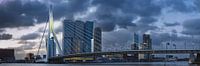 In de grijze sluiers van de februarimorgen strekt zich een panorama van de Nieuwe Maas uit, genesteld tussen de wolkenkrabbers van Rotterdam, Zuid-Holland. De Erasmusbrug, een majestueuze verbinding tussen de oevers, staat trots maar fijntjes verlicht in de schemering, alsof hij zijn eigen melodie zingt in de wazige sfeer van de dag.