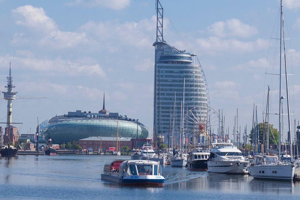 Nieuwe haven met jachthaven, Klimahaus en Atlantic Sail City Hotel , Havenwelten, Bremerhaven, Bremen, Duitsland, Europa