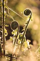 Een laagstaande avondzon verlicht de nieuwe uitlopende varenbladeren in de lente. Pteridium aquilinum ook bekend als varens is een veel voorkomende heide- en bosplant in Europa. Prachtige natuurprint met overheersende kleuren groen en goud.