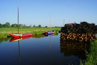 Foto van gekleurde bootjes en een stapel hout bij de Nieuwkoopse Plassen. Een rustig landschap met blauwe lucht en weerspiegeling in een sloot in de polder.