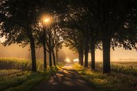 Op deze foto zie je een prachtige laan met bomen in Nieuwkuijk, Brabant. Het is vroeg in de ochtend, en er hangt een lichte nevel in de lucht. De zon komt net op, waardoor de lucht een warme gloed krijgt. De bomen langs de laan staan in een rij en zijn omgeven door een rustige sfeer. Het is een serene en mooie ochtend waar de natuur ontwaakt onder de zachte stralen van de opkomende zon.