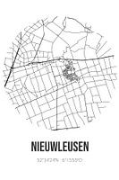 Zwart-witte landkaart, stratenplan of plattegrond van Nieuwleusen. Nieuwleusen is gelegen in de gemeente Dalfsen, provincie Overijssel. Op de stadskaart zijn alle openbare wegen in Nieuwleusen opgenomen. Verder is de kaart voorzien van de coördinaten van het centrum van Nieuwleusen.