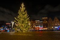 Nieuwmarkt in Amsterdam met kerstmis bij zonsondergang in Nederland