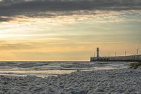 Landschap op het strand van Nieuwpoort, in West-Vlaanderen, tijdens het gouden uur voor zonsondergang. Op de voorgrond zie je het schuim van de Noordzee, en op de achtergrond het westerstaketsel met de signaallantaarn.
