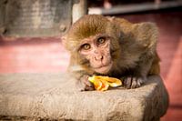 Nieuwsgierig aapje zoekt contact tijdens het eten van een bloem die hij bij de offers heeft 'gejat'. Portret van een aap bij de apentempel Swayambhunath, temple of the apes. Stoepa. Klein aapje met grote ogen.