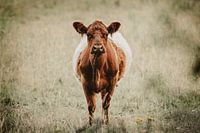 Een sfeervolle en eigentijdse foto van een nieuwsgierige Belted Galloway koe, die recht in de lens kijkt. Dit imposante rund, met zijn kenmerkende witte band om de buik, straalt zowel kracht als vriendelijkheid uit. De foto is bewerkt in warme groen- en bruintinten, waardoor hij perfect past in een modern interieur. De zachte kleurtonen en het natuurlijke licht geven het beeld een rustgevende en stijlvolle uitstraling, ideaal voor liefhebbers van landelijke en minimalistische woonstijlen.