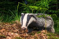 Nieuwsgierige Das (Meles meles) in een donker eikenbos, Ashdown Forest, Sussex, Engeland. © James Warwick / Nature in Stock