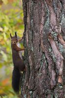 Nieuwsgierige Eekhoorn die even een kijkje neemt. De foto is gemaakt in een park op de Veluwe. De eekhoorn is mooi vrij van de herfstachtige achtergrond. De mooie en zachte herfstkleuren staan mooi in contrast met de grillige en harde kleuren van de stam van een naaldboom.