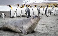 Te midden van de ruige, door de wind geteisterde stranden van Zuid-Georgië tilt een jonge zeeleeuw nieuwsgierig zijn hoofd op, alsof hij de koninklijke vergadering van koningspinguïns achter zich erkent. Het scherpe contrast tussen de gladde, zandkleurige huid van de zeeolifant en het opvallende zwart-gouden verenkleed van de pinguïns…