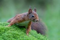 Het eekhoorntje kijkt nieuwsgierig wat er allemaal gebeurt . Groen bosachtergrond. foto is in Noord Brabant in Nederland gemaakt.