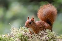 Nieuwsgierig kijkt het eekhoorntje vanachter het gras vandaan. Groene bokeh achtergrond. Bos als achtergrond. Sciurus vulgaris