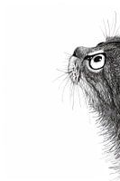 Deze minimalistische illustratie toont een kat wiens nieuwsgierige blik naar boven is gericht. De fijne lijnen en de gedetailleerde weergave van de snorharen en ogen geven de afbeelding een levendige uitstraling. Door de effen achtergrond valt de kat op de voorgrond op, wat zijn nieuwsgierigheid en gratie benadrukt. Perfect voor liefhebbers van minimalistische kunst en katten, biedt dit stuk een elegante en tijdloze afbeelding van een geliefd huisdier.