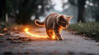 Deze scène toont een nieuwsgierige kat die speels achtervolgt op een pad in de schemering, omgeven door herfstbladeren en gloeiend licht. De nieuwsgierige en speelse aard van de kat wordt benadrukt door zijn dynamische beweging en aandachtige houding terwijl hij door het herfstlandschap zwerft. Het warme schemerlicht en het gloeiende…