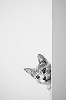 Deze charmante foto toont een nieuwsgierige kat die ondeugend van achter een muur gluurt. De minimalistische achtergrond benadrukt de fijne details van de kat en laat zijn grote ogen en expressieve gelaatstrekken opvallen. Deze eenvoudige maar expressieve foto legt de speelse aard en elegante gratie van de kat perfect vast. Ideaal voor liefhebbers van huisdieren en minimalistisch design.