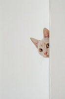 Deze charmante foto toont een nieuwsgierige kat die ondeugend van achter een muur gluurt. De minimalistische achtergrond benadrukt de fijne details van de kat en laat zijn grote ogen en expressieve gelaatstrekken opvallen. Deze eenvoudige maar expressieve foto legt de speelse aard en elegante gratie van de kat perfect vast. Ideaal voor liefhebbers van huisdieren en minimalistisch design.