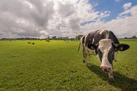 Een nieuwsgierige koe met op de achtergrond de molen.